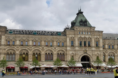 Rodeando a parte oriental da Praça Vermelha, com uma fachada de 240 metros, estão os Armazéns GUM, sigla em russo de estes Grandes Armazéns do Estado.